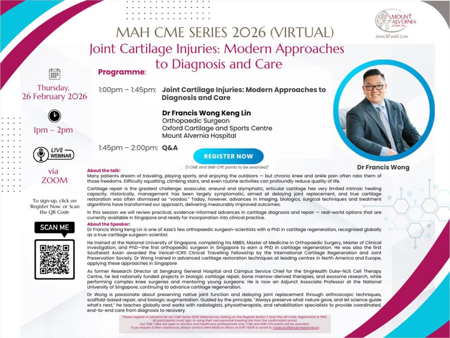 With this in mind, Dr Francis Wong Keng Lin delivered a CME session on 26 February 2026 as part of the Mount Alvernia Hospital CME Series 2026. Titled Joint Cartilage Injuries: Modern Approaches to Diagnosis and Care, the virtual session focused on understanding cartilage injuries, their healing potential, and current approaches to cartilage repair and joint preservation.